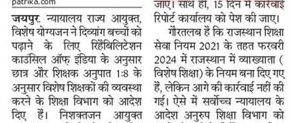 दिव्यांग बच्चों को पढ़ाने के लिए व्याख्याता लगाने के आदेश:- न्यायालय राज्य आयुक्त विशेष योग्यजन ने दिव्यांग बच्चों को पढ़ाने के लिए RCI के अनुसार छात्र शिक्षक अनुपात 1:8 के अनुसार विशेष शिक्षकों की व्यवस्था करने के शिक्षा विभाग को आदेश दिए हैं, निशक्तजन आयुक्त उमाशंकर शर्मा की ओर से आदेश जारी किए है कि 72 हजार से अधिक दिव्यांग बच्चे राज्य के विद्यालयों में अध्ययनरत है, माध्यमिक कक्षाओं में लगभग 12 हजार दिव्यांग विद्यार्थी अध्ययनरत है, ऐसे में उनको पढ़ाने के लिए व्याख्याता विशेष शिक्षकों Special teacher 1st grade की आगामी 30 दिन में व्यवस्था की जाए साथ ही कार्यवाही की रिपोर्ट कार्यालय में पेश की जाए| गौरतलब है कि राजस्थान शिक्षा सेवा नियम 2021 के तहत फरवरी 2024 में राजस्थान में व्याख्याता विशेष शिक्षक के नियम बना दिए, लेकिन आगे की कार्यवाही नहीं की गई| ऐसे में सर्वोच्च न्यायालय के आदेश अनुरूप शिक्षा विभाग को कार्यवाही के निर्देश प्रदान किए गए| राजस्थान प्राथमिक एवं माध्यमिक शिक्षक संघ के प्रदेशाध्यक्ष विपिन प्रकाश शर्मा ने विशेष योग्यजन न्यायालय में दिव्यांग बच्चों को पढ़ने के लिए व्याख्याता विशेष शिक्षक special teacher को लगाने के लिए कार्यवाही की मांग की थी Special teacher vacancy Special teacher vacancy news